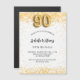 For an elegant 90th birthday party. A chic white background. Decorated with faux gold glitter, sparkles. Personalize and add a name, age and party details. The name is written with a hand lettered style script. Number 90 with balloon style font.