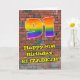 This fun and exciting urban street art and graffiti themed birthday greeting card design features a large number “91” with a colorful rainbow spectrum gradient inspired pattern, along with the message “Happy 91st Birthday,”, and an editable name. The background of the front has a brick wall pattern. The inside features a custom birthday greeting message, or could perhaps be cleared and left blank if a message is to be written by hand instead. A vibrant, editable birthday greeting card like this might be sent to celebrate somebody’s ninety-first birthday. [~Z0000586]