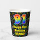 This cheerful and joyful music themed birthday paper cup design features a large number “91” with a rainbow spectrum gradient inspired pattern, along with the message “Happy 91st Birthday,”, and a custom name. The background features a vibrant and colorful music notes and symbols pattern. Colorful, vibrant paper cups like this might be fun to use at a birthday party being held to honor somebody’s 91st birthday. [~Z0000541]
