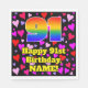 This happy and joyful birthday themed paper napkin design features a large number “91” with a rainbow spectrum gradient inspired pattern, along with the message “Happy 91st Birthday,”, and a customizable name. The background features a pattern of pink, red, and purple heart shapes. Loving, happy paper napkins like this might be fun to have at a birthday party being held to honor somebody’s ninety first birthday. [~Z0000550]