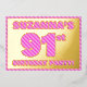 The front of this fun and bold ninety-first birthday party/celebration foil announcement card features a custom name, a large number “91st”, the message “BIRTHDAY PARTY!”, and a border, all featuring a girly dark pink and light pink lines pattern. The back features personalized details about the event, such as the date, time, venue/location, and any other useful information. Editable invitations like these might be used to invite attendees to a birthday party being held in celebration of somebody’s 91st birthday. [~Z0000597]