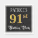 This fancy and opulent birthday-themed paper napkin design features a customizable name and the message “91st Birthday Party”. The large number “91st” has a faux/imitation gold-inspired coloring pattern, the words “Birthday Party” are in luxurious script-style text, and the background is colored black by default (although it can be customized). Elegant, luxurious paper napkins like this might be useful to have at a birthday celebration being held to celebrate somebody’s ninety first birthday. [~Z0000565]