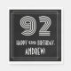 This vintage appearance birthday themed paper napkin design features a large Art Deco style inspired number "92", the message "HAPPY 92nd BIRTHDAY,", a custom name, and a border pattern consisting of lines. Fun, customized birthday themed paper napkins like this might be used at somebody’s ninety second birthday celebration. [~Z0000395]