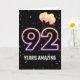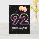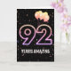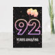 Party balloons and confetti on black background with the neon number 92 for a 92nd birthday.