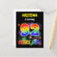 The front of this fun and lively birthday party invitation postcard design has a customizable name, a vibrant bursting celebratory fireworks inspired pattern, and the message "92 YEARS OLD!" having a colorful rainbow spectrum inspired gradient pattern. The back features a personalized message that could describe when and where the party is being held, in addition to other relevant information. Invitation postcards like this might be sent to potential attendees of a party being held to celebrate the birthday of somebody who is turning 92 years old. [~Z0000452]