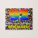 This bold and colorful birthday themed jigsaw puzzle design features a large number “92” with a multicolored rainbow spectrum inspired gradient pattern, along with the message “HAPPY 92nd BIRTHDAY,”, and a personalized recipient name. The background has an upbeat pattern of loving hearts with various sizes and colors. An exciting, customizable birthday puzzle like this might be given in celebration of somebody’s ninety-second birthday. [~Z0000611]