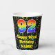 This exciting and colorful music themed birthday paper cup design features a large number “92” with a rainbow spectrum gradient inspired pattern, along with the message “Happy 92nd Birthday,”, and an editable name. The background features a multicolored pattern having music notes and symbols of various sizes and colors. Vibrant, colorful paper cups like this might be fun to have at a birthday party/celebration being held to honor somebody’s ninety second birthday. [~Z0000541]