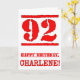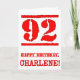 This fun birthday-themed greeting card design features a large red number “92” having a rubber stamp inspired look, along with the birthday greeting message “HAPPY BIRTHDAY,” and an editable name on the front. The inside has a customizable birthday greeting message, or could perhaps be cleared and left blank if a message is to be written by hand instead. A fun editable birthday greeting card like this might be a fun way to deliver a birthday greeting message to somebody who is celebrating their ninety-second birthday. [~Z0000524]