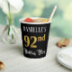 This luxurious and fancy birthday themed paper cup design features a custom name and the message “92nd Birthday Party”. The large number “92nd” has a faux/imitation gold-inspired coloring pattern, the words “Birthday Party” are in ornate script-style text, and the background is colored black by default (although it can be customized). Opulent, elegant paper cups like this might be useful to have at a birthday celebration/party being held to celebrate somebody’s 92nd birthday. [~Z0000567]