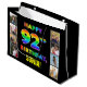 This bold and upbeat birthday gift bag design features the message “HAPPY 92ND BIRTHDAY,“ with a vibrant multicolored rainbow spectrum inspired gradient pattern, along with a customizable recipient name. To the left and the right of the rainbow-patterned message on the front are some photos that can be personalized, perhaps with photos of the recipient, the recipient’s family and friends, and/or the sender(s) of the gift. A gift bag like this might be used when wrapping presents or gifts being given to somebody in celebration of their ninety-second birthday. (Photography © Storytree Studios, Stanford, CA.) [~Z0000668]