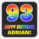 This fun, colorful, and cheerful birthday themed sticker design features a large number "93" and the message "HAPPY BIRTHDAY,", both colored with a rainbow spectrum gradient inspired pattern, along with a bold yellow custom name. The background is colored black. Fun stickers like this might be used when wrapping a birthday present or gift being given to somebody who is celebrating their ninety third birthday, or perhaps might be given out to the attendees at a birthday party. [~Z0000480]