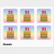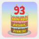 This cheerful and colorful birthday square sticker design features a cartoon-style depiction of a three-tier birthday cake having numeral-shaped candles on top showing the number “93“, along with the message “HAPPY 93RD BIRTHDAY,”, and a custom recipient name. The background features a multicolored pastel rainbow spectrum inspired gradient pattern. Birthday themed stickers like these might be distributed or used at a birthday party celebrating somebody’s 93rd birthday, or perhaps used when preparing invitations or wrapping presents/gifts for such an event. [~Z0000624]