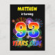 The front of this fun and lively birthday party invitation postcard design features a personalized name, a vibrant bursting celebratory fireworks inspired pattern, and the message "93 YEARS OLD!" having a colorful rainbow spectrum inspired gradient pattern. The back features a personalized message that could include details about the birthday party, such as when it is happening and where it is being held. Invitation postcards like this could be sent to potential guests of a birthday party being held to celebrate somebody’s ninety third birthday. [~Z0000452]