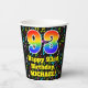 This joyful and exciting music-themed birthday paper cup design features a large number “93” with a rainbow spectrum gradient inspired pattern, along with the message “Happy 93rd Birthday,”, and an editable name. The background features an exciting and colorful pattern having music notes and symbols of various colors and sizes. Vibrant, colorful paper cups like this might be fun to use at a birthday party/celebration being held in celebration of somebody’s 93rd birthday. [~Z0000541]