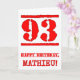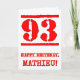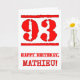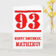 This fun birthday-themed greeting card design features a large red number “93” having a rubber stamp inspired appearance, along with the birthday greeting message “HAPPY BIRTHDAY,” and a customizable name on the front. The inside has a customized birthday greeting message, or could perhaps be cleared and left blank if a message is to be written by hand instead. A fun editable birthday greeting card like this might be sent to celebrate somebody’s ninety-third birthday. [~Z0000524]