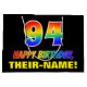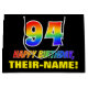 This colorful, fun, and cheerful birthday themed gift bag design features a large number "94" and the message "HAPPY BIRTHDAY,", both colored with a rainbow spectrum gradient inspired pattern, along with a bold yellow personalized recipient name. The background is colored black. A fun birthday themed gift bag like this could be used to wrap a gift or present being given to celebrate somebody’s ninety fourth birthday. [~Z0000477]