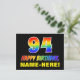 The front of this cheerful, colorful, and fun birthday postcard design features a large number "94" and the message "HAPPY BIRTHDAY,", both having a rainbow spectrum gradient inspired pattern coloring, along with a bold yellow personalized recipient name. The front also features a plain black colored background. The back of the postcard has a customizable birthday greeting message, or could perhaps be cleared and left blank if a message is to be written by hand instead. An exciting customizable birthday postcard like this might be a fun way to send a message celebrating somebody’s ninety fourth birthday. [~Z0000474]