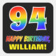 This cheerful, fun, and colorful birthday-themed sticker design features a large number "94" and the message "HAPPY BIRTHDAY,", both colored with a rainbow spectrum gradient inspired pattern, along with a bold yellow customizable name. The background is colored black. Fun stickers like this might be used when wrapping gifts being given to somebody in celebration of their 94th birthday, or perhaps maybe be handed out to the attendees at a birthday celebration. [~Z0000480]