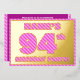 The front of this bold and fun ninety-fourth birthday celebration/party foil invitation card features a personalized name, a large number “94th”, the message “BIRTHDAY PARTY!”, and a border, all featuring a feminine dark pink and light pink lines pattern. The back features personalized details about the event, such as the date, time, venue/location, and any other information that may be important. Editable invitations like these might be used to invite attendees/guests to a birthday party being held to celebrate somebody’s 94th birthday. [~Z0000597]