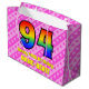 This happy and fun 94th birthday themed gift bag design features a large number "94" having a pattern inspired by the look of a rainbow spectrum. It also features the message "Happy 94th Birthday,", and an editable name. The background features a fun pattern of dark pink and light pink stripes containing loving pink heart shapes. A gift bag like this might be used when wrapping gifts or presents being given to celebrate somebody’s ninety fourth birthday. [~Z0000414]