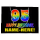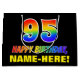 This cheerful, colorful, and fun birthday-themed gift bag design features a large number "95" and the message "HAPPY BIRTHDAY,", both colored with a rainbow spectrum gradient inspired pattern, along with a bold yellow editable recipient name. The background is colored black. A fun gift bag like this might be used when giving a gift or present in honor of somebody’s 95th birthday. [~Z0000477]