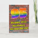 This fun and vibrant urban graffiti and street art inspired birthday greeting card design features a large number “95” having a multicolored rainbow spectrum gradient inspired pattern. It also features the message “Happy 95th Birthday,”, and a customizable name. The background of the front features a brick wall pattern. The inside features a custom birthday greeting message, or could perhaps be cleared and left blank if a message is to be written by hand instead. A colorful, customized birthday greeting card like this might be used to acknowledge somebody’s ninety-fifth birthday. [~Z0000586]
