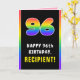 This fun and upbeat birthday greeting card design features a big number “96“ with a multicolored rainbow spectrum inspired gradient pattern, along with the message “HAPPY 96th BIRTHDAY,”, and a custom recipient name. The inside has an editable birthday greeting message, or could perhaps be cleared and left blank if a message is to be written by hand instead. A cheerful, customized birthday greeting card like this might be sent in celebration of somebody’s ninety-sixth birthday. [~Z0000636]