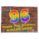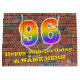 This fun and vibrant birthday themed gift bag design, inspired by urban art, features a large number "96" with a rainbow spectrum gradient inspired pattern, along with the message "Happy 96th Birthday,", and a custom name. It also has a brick wall style pattern background. A gift-bag like this might be used when giving a gift or present in honor of somebody’s 96th birthday. [~Z0000522]