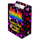 This joyful and happy birthday-themed giftbag design features a large number “96” with a rainbow spectrum gradient inspired pattern, along with the message “Happy 96th Birthday,”, and an editable name. The background features a pattern of heart shapes with colors like purple, red, and pink. A cheerful birthday themed gift bag like this might be a fun way to wrap a gift or present being given to celebrate somebody’s ninety sixth birthday. [~Z0000551]