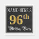 This opulent and elegant birthday themed paper napkin design features an editable name and the message “96th Birthday Party”. The large number “96th” has an imitation/faux gold-inspired coloring pattern, the words “Birthday Party” are in ornate script-style text, and the background is colored black by default (although it can be customized). Luxurious, fancy paper napkins like this might be used at a birthday celebration being held in celebration of somebody’s 96th birthday. [~Z0000565]