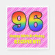 This fun and festive 96th birthday-themed paper napkin design features a large number "96" having a colorful pattern inspired by the look of a rainbow spectrum. It also features the message "Happy 96th Birthday,", followed by a customizable name. The background features a pattern of light pink and dark pink stripes containing loving pink heart shapes. Birthday themed paper napkins like this might be used at a party celebrating somebody’s 96th birthday. [~Z0000417]