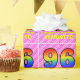 This festive and fun 96th birthday-themed wrapping paper design features a large number "96" having a colorful rainbow spectrum inspired gradient pattern. It also features the message "Happy 96th Birthday,", and a personalized name. The background features a fun pattern of light pink and dark pink stripes containing loving pink heart shapes. Wrapping paper like this might be used when wrapping gifts being given to somebody in celebration of their ninety sixth birthday. [~Z0000415]