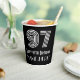 This vintage style and 1920s-1930s style inspired birthday paper cup design features a large art deco inspired appearance number “97”, in addition to the birthday greeting message “Happy 97th Birthday,” and an editable name. The background is colored black. Birthday themed paper cups like this might be a fun way to celebrate somebody’s 97th birthday. [~Z0000542]