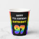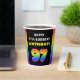 This bold and upbeat birthday paper cup design features a large number “97“ with a multicolor rainbow spectrum inspired gradient pattern, along with the message “HAPPY 97th BIRTHDAY,”, and a custom recipient name. Cheerful birthday themed paper cups like this might be used at a birthday party in celebration of somebody’s ninety seventh birthday. [~Z0000639]