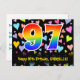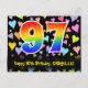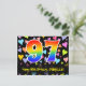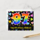 The front of this loving, colorful, and exciting birthday postcard design features a large number "97" having a rainbow spectrum gradient inspired pattern. It also features the message "Happy 97th Birthday,", and a personalized recipient name. The front additionally has a colorful and vibrant loving hearts background pattern. The back features a personalized birthday greeting message, or could perhaps be cleared and left blank if a message is to be written by hand instead. A personalized birthday postcard like this might be a fun way to acknowledge somebody’s ninety seventh birthday. Postcards like this might also be used to invite guests to a birthday celebration being held for somebody who is turning 97 years old. [~Z0000448]