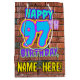 The front of this fun birthday themed gift bag design features the message “HAPPY 97TH BIRTHDAY,” having a vibrant, colorful, urban street art and graffiti inspired look, in addition to a personalized recipient name. The background features a brick wall inspired pattern. A gift bag like this might be used when wrapping gifts being given to somebody in celebration of their 97th birthday. [~Z0000536]