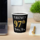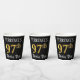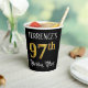 This luxurious and fancy birthday themed paper cup design features a custom name and the message “97th Birthday Party”. The large number “97th” has a faux/imitation gold-inspired coloring pattern, the words “Birthday Party” are in ornate script-style text, and the background is colored black by default (although it can be customized). Elegant, opulent paper cups like this might be useful at a birthday celebration being held to honor somebody’s 97th birthday. [~Z0000567]