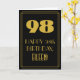 The front of this vintage style birthday-themed greeting card design features a large art deco look inspired number "98", the message "HAPPY 98th BIRTHDAY,", a personalized name, and a border pattern consisting of lines. There is a black-colored background on the front. The inside features an editable birthday greeting message, or could perhaps be cleared and left blank if a message is to be written by hand instead. A customizable birthday card like this might be a fun way to send birthday wishes to somebody who is celebrating their ninety eighth birthday. [~Z0000502]