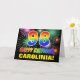 The front of this cheerful, colorful, and fun birthday themed greeting card design features a large number "98" and the message "HAPPY BIRTHDAY,", both colored with a rainbow spectrum gradient inspired pattern, along with a bold yellow custom recipient name. The front also features a multicolored background pattern inspired by the appearance of bursting celebratory fireworks. The inside features a customized birthday greeting message, or could perhaps be cleared and left blank if a message is to be written by hand instead. An exciting birthday card like this might be a fun way to send birthday wishes to somebody who is celebrating their ninety eighth birthday. [~Z0000471]