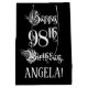 This lavish and elaborate birthday themed giftbag design features the message “Happy 98th Birthday,” in formal script style text, on a black colored background. It also has a custom recipient name. A birthday themed gift bag like this might be used when giving a gift or present in celebration of somebody’s ninety eighth birthday. [~Z0000557]