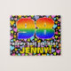 This vibrant and eye-catching birthday jigsaw puzzle design features a large number “98” with a multicolored rainbow spectrum inspired gradient pattern, along with the message “HAPPY 98th BIRTHDAY,”, and a custom recipient name. The background features an upbeat pattern of loving heart shapes of various colors and sizes. A bold, personalized birthday puzzle like this might be a fun way to deliver birthday wishes to somebody who is celebrating their ninety-eighth birthday. [~Z0000611]