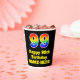 This fun and exciting birthday themed paper cup design features a large number “99” having a rainbow spectrum gradient inspired pattern. It also features the message “Happy 99th Birthday,”, and a custom name. It also has a black-colored background. Colorful, vibrant paper cups like this might be fun to use at a birthday celebration/party being held in celebration of somebody’s 99th birthday. [~Z0000537]