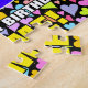 This bold and colorful birthday-themed jigsaw puzzle design features a large number “99” with a multicolored rainbow spectrum inspired gradient pattern, along with the message “HAPPY 99th BIRTHDAY,”, and a personalized recipient name. The background has an upbeat, colorful, heart shapes pattern. An eye-catching, customizable birthday puzzle like this might be given in celebration of somebody’s ninety-ninth birthday. [~Z0000611]