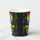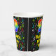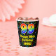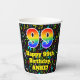 This cheerful and exciting music themed birthday paper cup design features a large number “99” with a rainbow spectrum gradient inspired pattern, along with the message “Happy 99th Birthday,”, and a customizable name. The background features a multicolored pattern having music notes and symbols of various colors and sizes. Colorful, vibrant paper cups like this might be fun to use at a birthday party/celebration being held to honor somebody’s ninety ninth birthday. [~Z0000541]