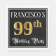 This luxurious and fancy birthday themed paper napkin design features an editable name and the message “99th Birthday Party”. The large number “99th” has a faux/imitation gold-inspired coloring pattern, the words “Birthday Party” are in ornate script-style text, and the background is colored black by default (although it can be customized). Elegant, opulent paper napkins like this might be used at a birthday celebration/party being held to honor somebody’s 99th birthday. [~Z0000565]