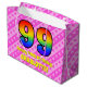 This fun and upbeat 99th birthday-themed gift bag design features a large number "99" having a pattern inspired by the look of a rainbow spectrum. It also features the message "Happy 99th Birthday,", and an editable name. The background features a light pink and dark pink stripes pattern containing loving pink heart shapes. A gift bag like this might be used when wrapping gifts or presents being given in honor of somebody’s ninety ninth birthday. [~Z0000414]