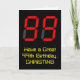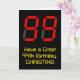 The front of this nerdy and silly birthday themed greeting card design features a large number "99" having a red seven segment digital display style appearance, along with the message "Have a Great 99th Birthday," and an editable name, on a black colored background. The inside features a personalized birthday greeting message, or could perhaps be cleared and left blank if a message is to be written by hand instead. A personalized birthday card like this might be a fun way to acknowledge somebody’s ninety ninth birthday. [~Z0000386]