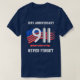 Contemporary design in honor of the 10th Anniversary of the terror attacks on September 11th. Patriotic remembrance t-shirts with American flag waving behind the Twin Towers. Value-priced tshirts and matching accessories at significant discounts in bulk for memorial observations and fundraising events to benefit 9/11 victims' support groups and organizations. Optional image replacement for group sponsored logo or tagline. Please contact us if you would like any design customized specifically for your business, company, or organization for memorial events. There is no extra charge for customization. Patriotic 10th Anniversary -- 9/11 remembrance gifts, t-shirts, apparel, buttons, hats, magnets, and commemorative keepsakes and souvenirs.