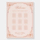 It has 9 tables (3 rows, 3 columns) and a vintage ornate frame with faux rose gold decorations in the corners. In the upper part, there is the word Welcome, written in a big elegant calligraphic script. The names of the bride and groom are written in the same calligraphy, but smaller, near the lower border. The rest of the text is in caps. The background is blush pink, the text has a color similar to the rose gold frame.