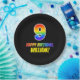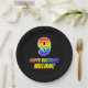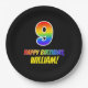 This fun, cheerful, and colorful birthday-themed paper plate design features a large number "9" and the message "HAPPY BIRTHDAY,", both colored with a rainbow spectrum gradient inspired pattern, along with a bold yellow personalized name. It has a black colored background. Fun, personalized birthday themed paper plates like this might be used at somebody’s 9th birthday party. [~Z0000488]
